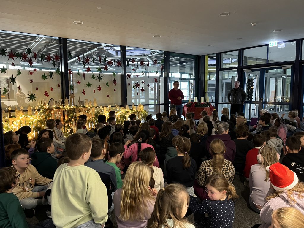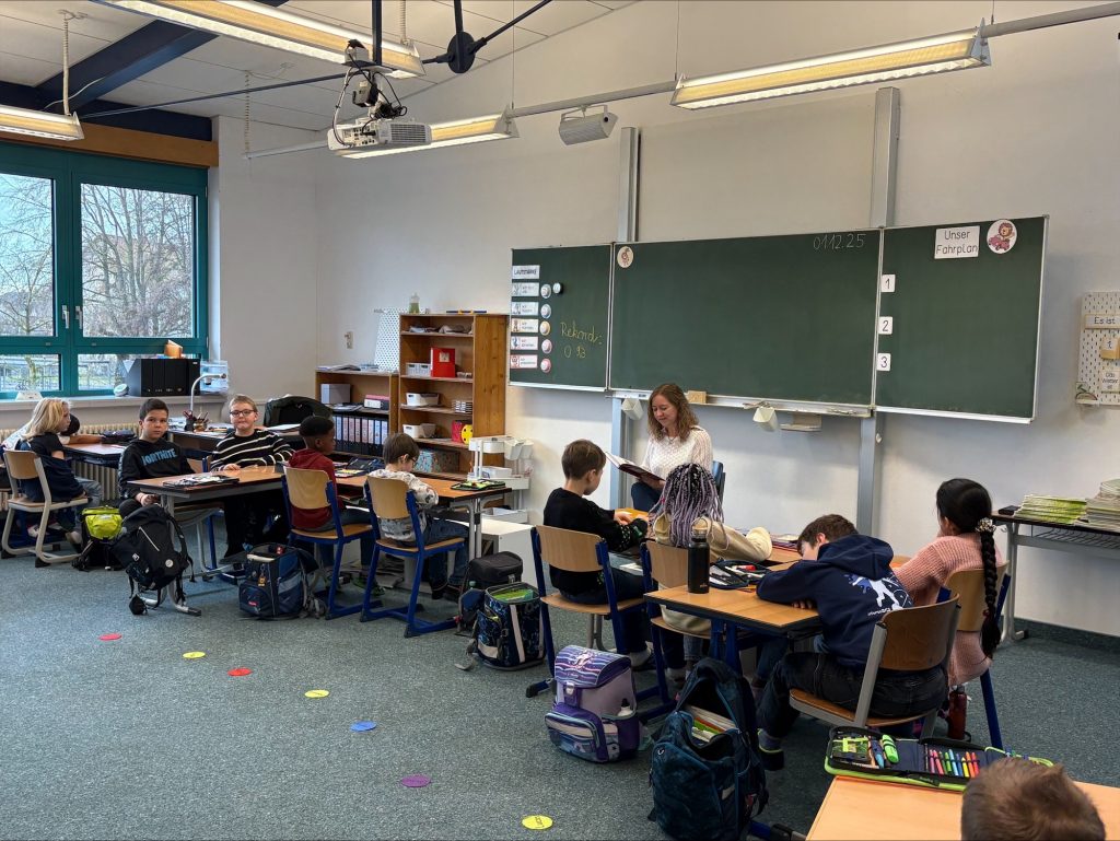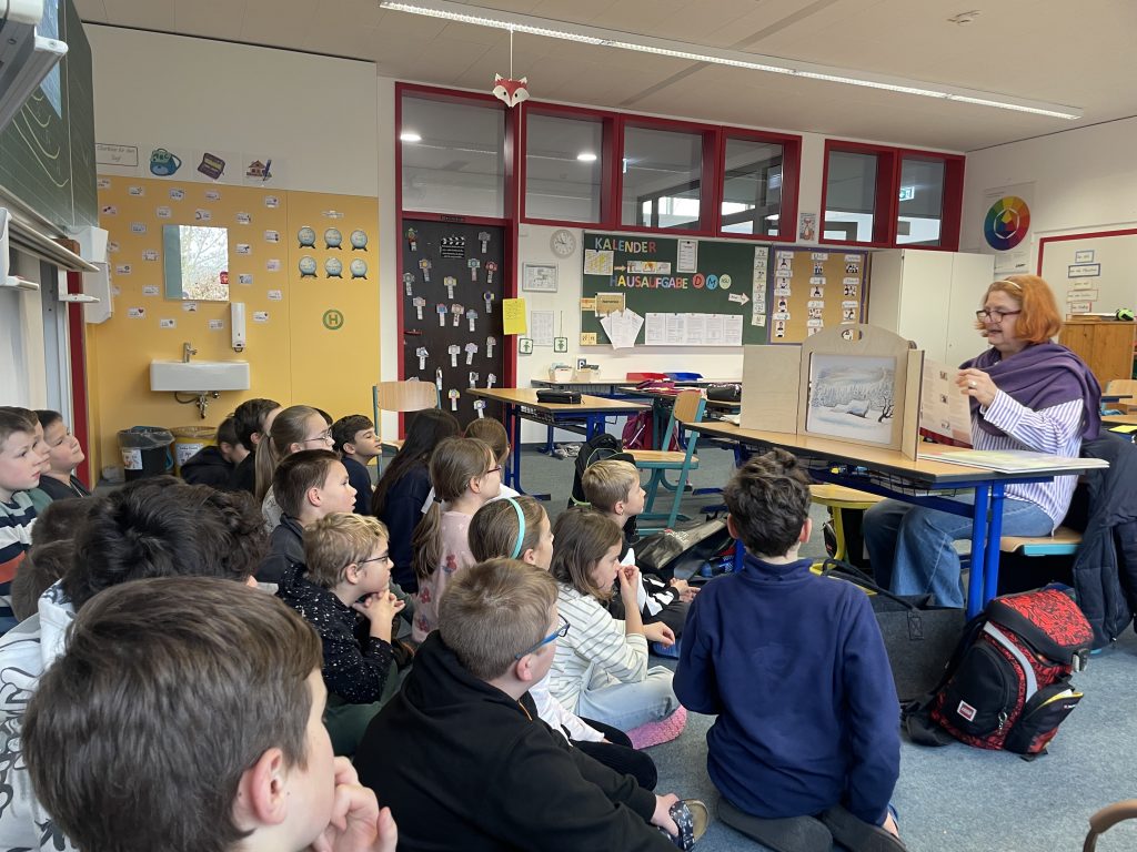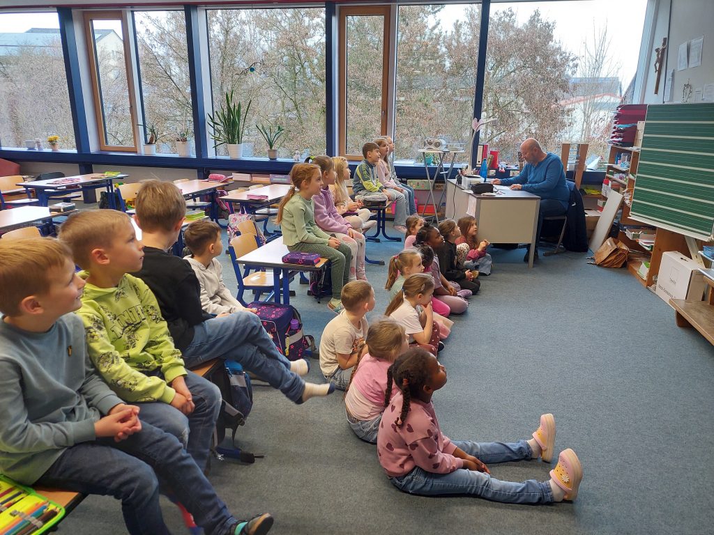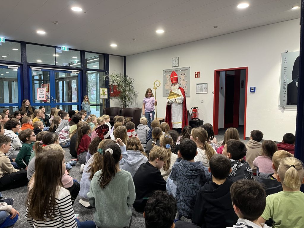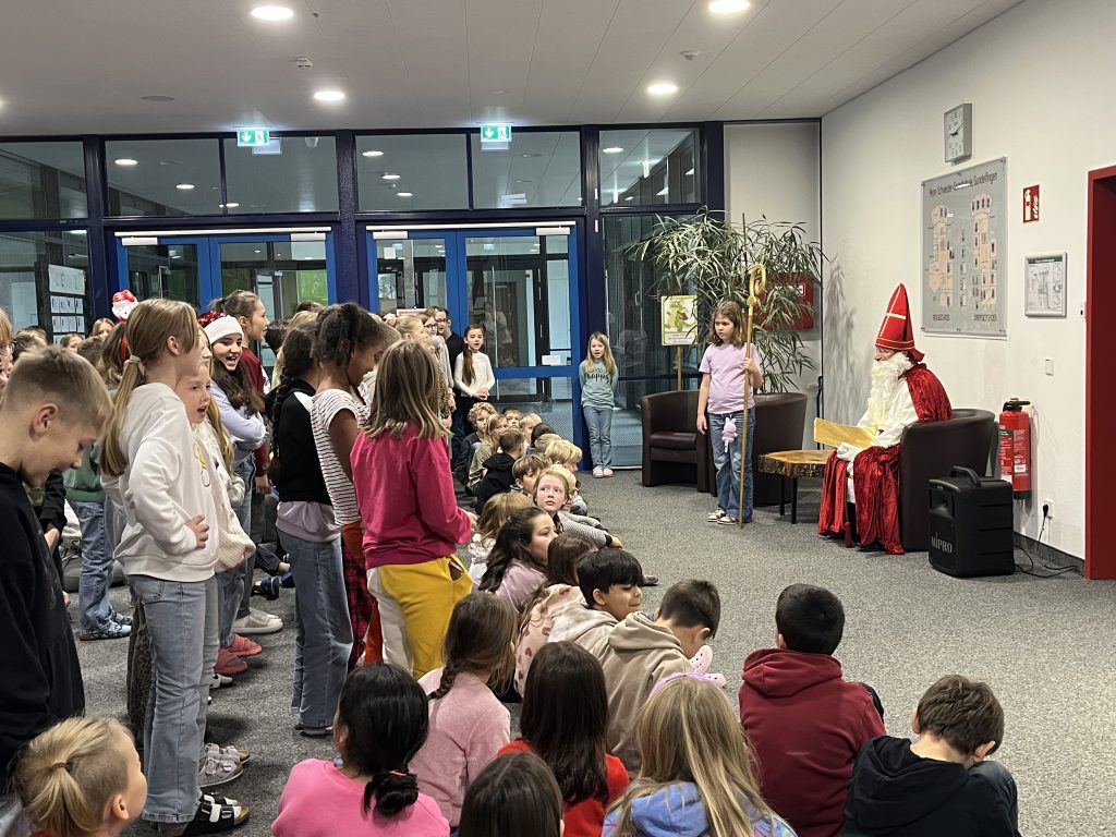 Auch in diesem Jahr hat uns wieder der Nikolaus besucht. Nachdem er musikalisch von den Kindern und durch Frau Korner bzw. Frau Sturm begrüßt wurde, las er den Kindern aus seinem goldenen Buch vor. Er hatte sehr viel Positives zu berichten beispielsweise, dass die Erstklässler schon richtig schön in die Zeilen schreiben können, die Zweitklässler super leise arbeiten können, die Drittklässler sehr freundlich und hilfsbereit gegenüber den Lehrkräften sind und die Viertklässler sich gegenseitig bei schwierigen Aufgaben toll unterstützten. Den ein oder anderen Verbesserungsvorschlag hatte der Nikolaus allerdings auch parat. Er legte den Kindern ans Herz pünktlich aus der Pause zu kommen, Streit friedlich zu klären, im Unterricht leise zu sein und gut zuzuhören sowie Arbeitsaufträge genau zu lesen.